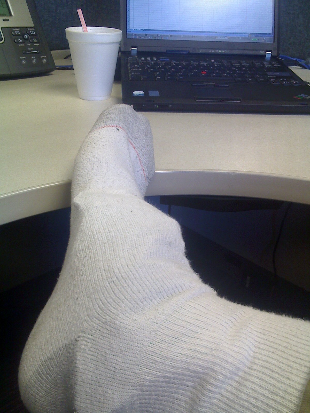 Monday morning, this is how I am at work now. Off my work shoes and an ice pack stuffed into my sock to ease of the soreness.