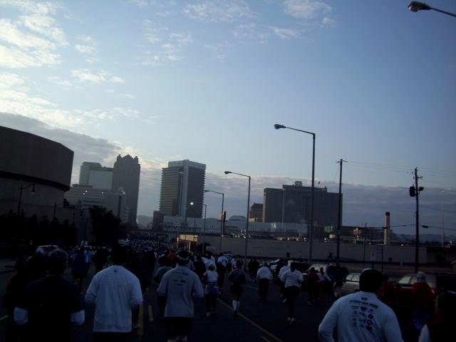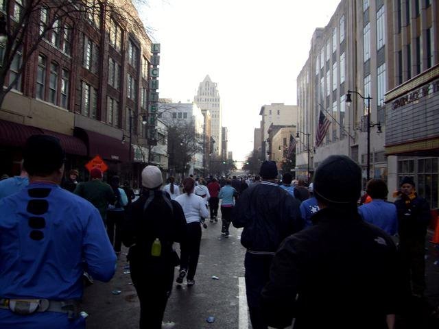 Got up early in the morning and headed to downtown to find a parking spot closer to the start line. It was 5 in the morning but it looked as if it was 8 in the evening. The city was buzzing with runners at every corners and as far as you eyes could reach. 32,000 runners from across the US and from the world. The second largest event in the country. The biggest I have run. RD decided to advance the race start time to 6:45AM against the usual start time of 7:00AM. It was corral start. The race day morning buzz was crazy. I was at the corral 20 along with my friends. My goal for the day was to meet the cut off. As simple as that. Was enjoying the moment. Never ever I have such a huge gathering of runners. Old, young, people from several age groups all gathered for one purpose. To cross the finish line. While waiting, there were curious runners who had loads of questions about my Vibram Five Fingers and I was proud to answer all their questions. Some even took a picture of my feet, only my feet, I am glad though, at least my feet will be famous. 🙂