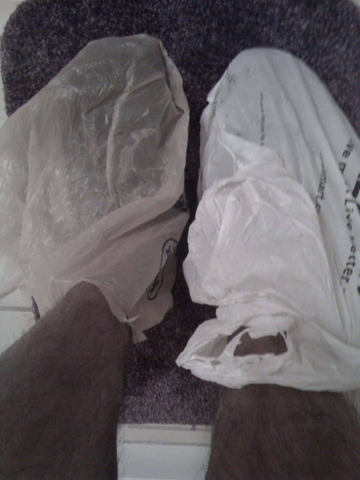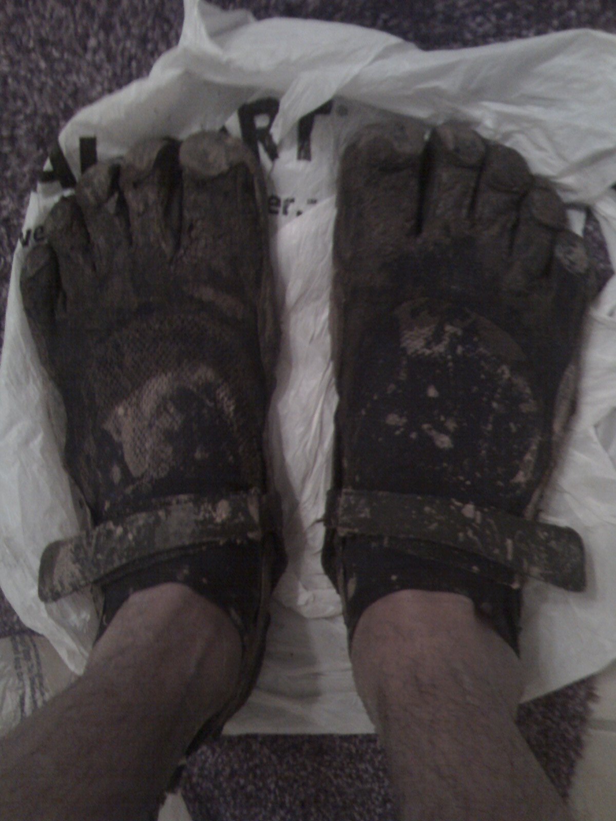 I was walking with my Vibram’s wearing those plastic bags and my neighbors gave me weird looks. Glad I wore them, my carpet is safe too. Cleaning them was no big deal. Just stand under the shower with those shoes and the dirt just got washed away. Sweet. Thanks Diane, John, Kim and Keith. You made my weekend.